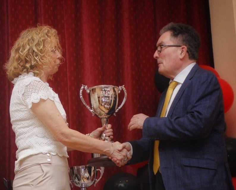 LEGACY…Veron Jackson presents the Ulster u-20 Cup, named after her daughter Karen, to Ulster LGFA President gerry Doherty. Photo; St Finbarr’s LGFA